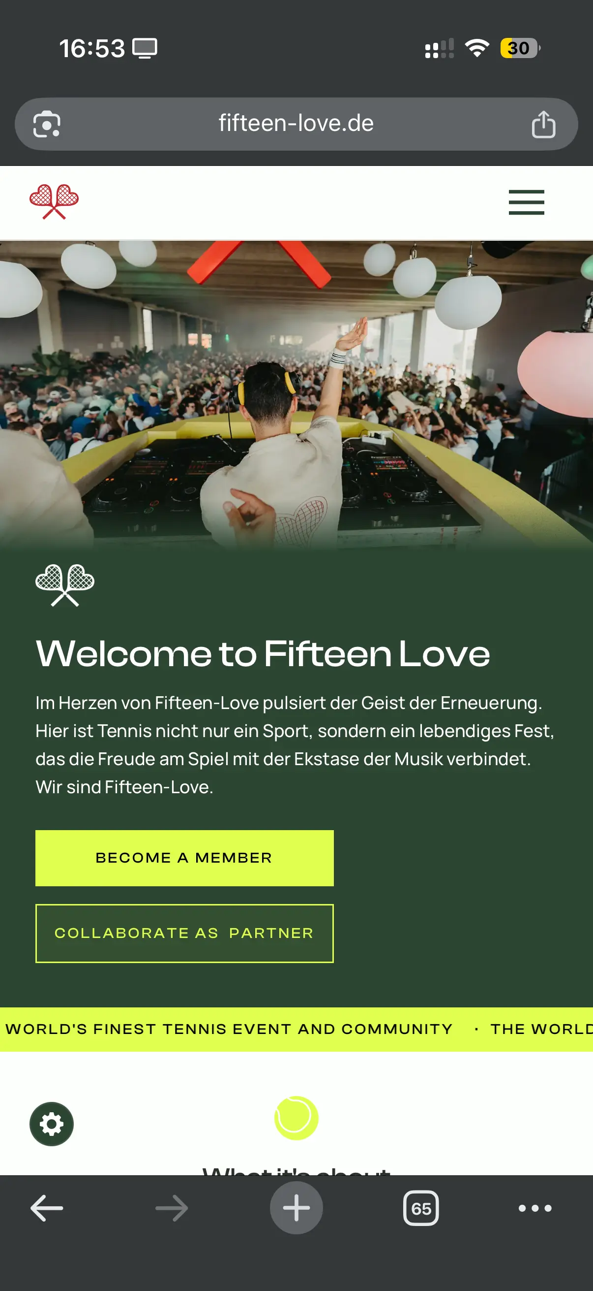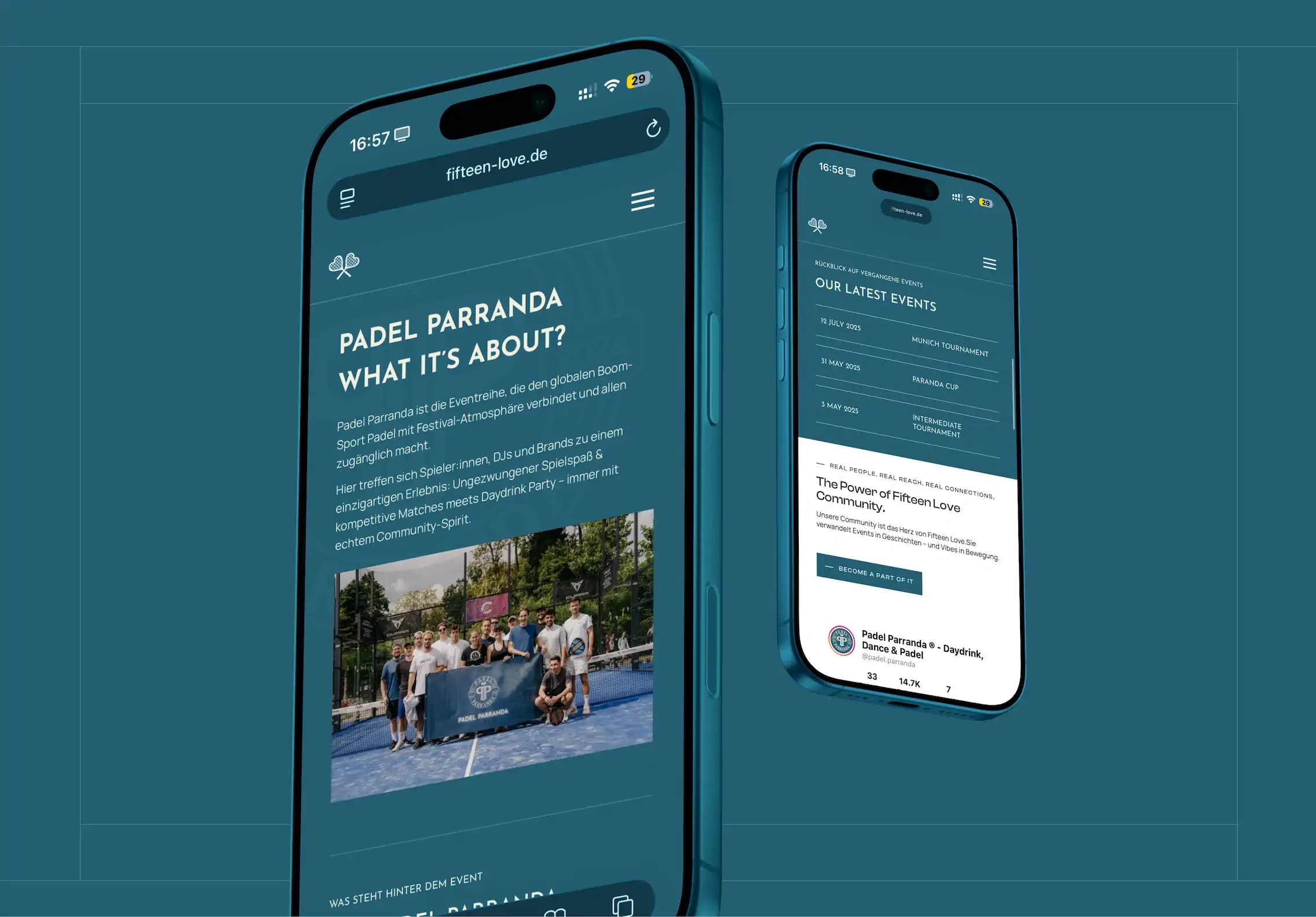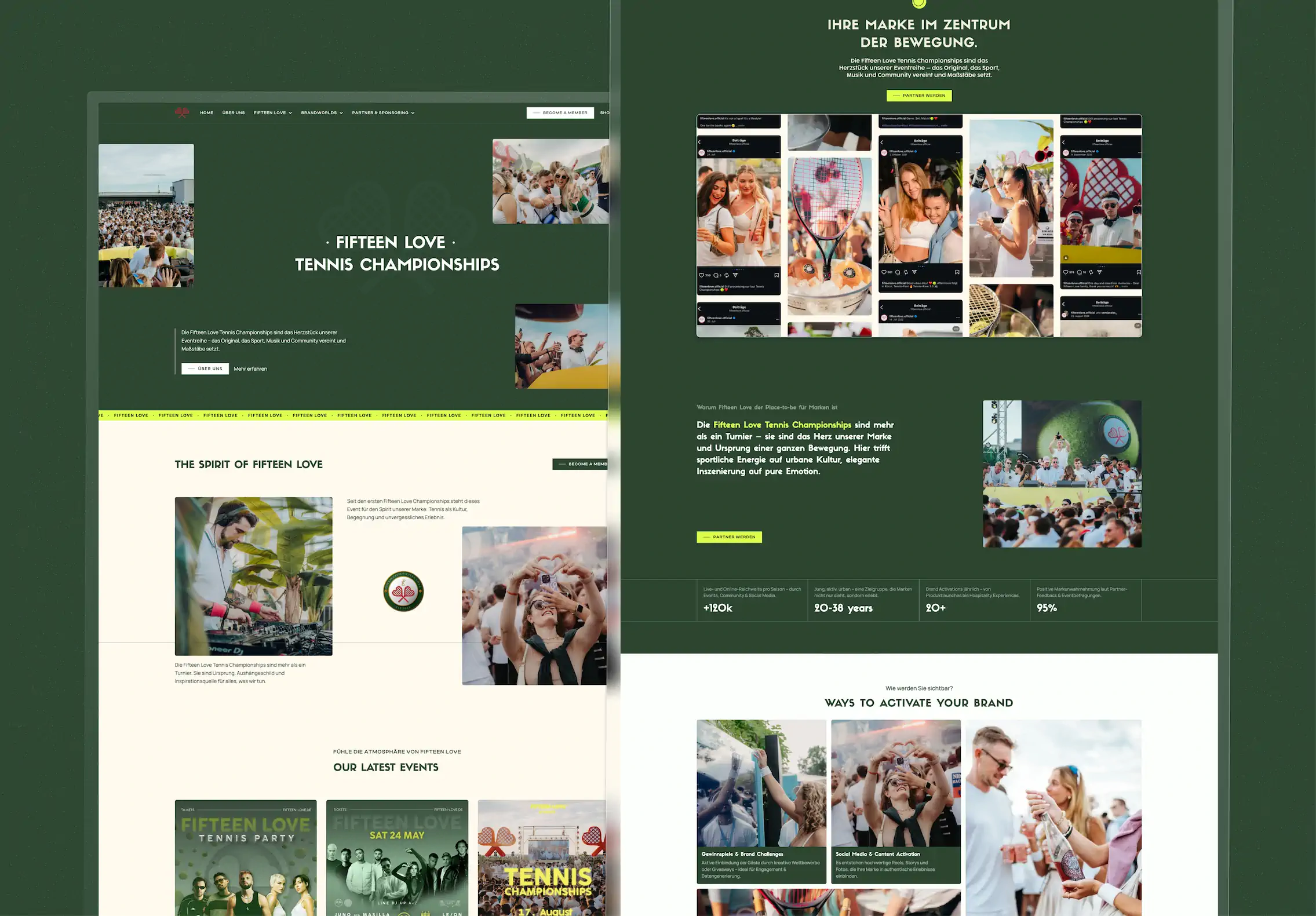 Technisch wurde die gesamte Plattform auf Skalierbarkeit ausgelegt. Ein CMS-gesteuertes Event-System ermöglicht es dem Fifteen Love Team, neue Veranstaltungen eigenständig anzulegen, Vorschauseiten zu erstellen und vergangene Events als Galerie zu archivieren. Der integrierte Membership-Bereich sowie die Registrierungsfunktion sorgen dafür, dass die Community nicht nur zuschaut, sondern aktiv Teil wird. Für Marken und Sponsoren wurde ein eigener Partner-Bereich entwickelt, der Kooperationsmöglichkeiten professionell präsentiert und die Reichweite der Plattform in harte Geschäftszahlen übersetzt. Ein Shop rundet das Gesamtpaket ab. Von der mobilen Ansicht bis zum Desktop-Erlebnis wurde jedes Detail so gestaltet, dass die Seite genauso elektrisierend wirkt wie die Events selbst.